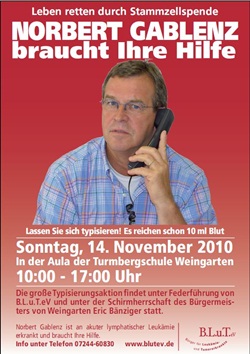 Bei einer Typisierungsaktion am Sonntag, den 14.11.2010 in der Grund- und Werkrealschule (Turmbergschule) Weingarten, Marktplatz 8, kann sich jeder gesunde Mensch zwischen 18 und 56 Jahren als neuer freiwilliger Stammzellspender registrieren lassen. Einer von ihnen könnte Norbert Gablenz das Leben retten! 10ml Blut genügen, um im Labor festzustellen, ob ein „genetischer Zwilling" für Norbert Gablenz aber auch für viele andere Patienten, die in diesem Augenblick verzweifelt auf einen Spender warten, gefunden werden konnte.