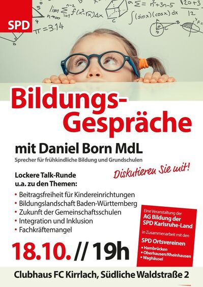 In Zusammenarbeit mit den Ortsvereinen der SPD Waghäusel, Hambrücken und Oberhausen-Rheinhausen lädt die AG Bildung der SPD Karlsruhe-Land alle interessierten Bürger herzlich zu den „Bildungsgesprächen“ ein. In lockerer Runde möchten wir uns mit Ihnen zu Themen wie Beitragsfreiheit für Kindereinrichtungen, der Bildungslandschaft im Bundesland, der Zukunft von Sprach-Kitas, Fragen der Inklusion in Kitas und Schulen, sowie dem Fachkräftemangel im Bildungssektor austauschen.