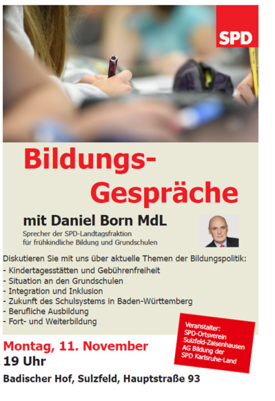 Der SPD-Ortsverein Sulzfeld-Zaisenhausen lädt in Zusammenarbeit mit der Arbeitsgemeinschaft für Bildung des SPD-Kreisverbands Karlsruhe-Land zu „Bildungsgesprächen“ ein. Als Referent konnte der SPD-Landtagsabgeordnete Daniel Born aus Schwetzingen gewonnen werden, der Sprecher der Landtagsfraktion für frühkindliche Bildung und Grundschulen ist.